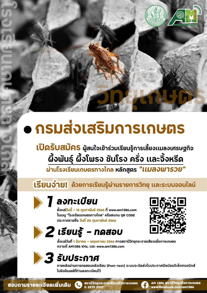 อธิบดีกรมส่งเสริมการเกษตร กล่าวอีกว่า เพื่อเป็นการเผยแพร่องค์ความรู้ด้านการเลี้ยงแมลงเศรษฐกิจที่ถูกต้องตามหลักวิชาการแก่เกษตรกรเป้าหมาย ให้สามารถนำองค์ความรู้ไปใช้ในการเลี้ยงแมลงเศรษฐกิจได้อย่างมีประสิทธิภาพ กรมส่งเสริมการเกษตร โดยสำนักพัฒนาการถ่ายทอดเทคโนโลยีได้กำหนดจัดกิจกรรมโรงเรียนเกษตรทางไกลให้กับเกษตรกรขึ้น มีพื้นที่ดำเนินการหลักใน 2 จังหวัด ได้แก่ จังหวัดสมุทรสงคราม และราชบุรี ซึ่งเป็นพื้นที่ทางการเกษตรที่สำคัญ ประกอบกับเกษตรกรในพื้นที่มีความสนใจในการเลี้ยงแมลงเศรษฐกิจเพื่อพัฒนาเป็นช่องทางการสร้างรายได้ให้กับครัวเรือน ทั้งนี้ กิจกรรมดังกล่าวจะเป็นการถ่ายทอดองค์ความรู้เสริมสร้างทักษะด้านการเลี้ยงแมลงเศรษฐกิจ 5 ชนิด ได้แก่ ผึ้งพันธุ์ ผึ้งโพรง ชันโรง ครั่ง และจิ้งหรีด ที่ถูกต้อง มีประสิทธิภาพ และเหมาะสมให้เกษตรกรเรียนรู้ผ่านการกระจายเสียงของสถานีวิทยุกระจายเสียงเพื่อการเกษตร คลื่นความถี่ A.M.1386 KHz. เว็บไซต์วิทยุออนไลน์ www.am1386.com สื่อเอกสารคำแนะนำ และการจัดกิจกรรมในพื้นที่ เพื่อให้เกษตรกรกลุ่มเป้าหมายได้มีความรู้ความเข้าใจในการเลี้ยงแมลงเศรษฐกิจที่สำคัญและสามารถลงมือปฏิบัติได้จริงเพื่อเป็นช่องทางการสร้างรายได้